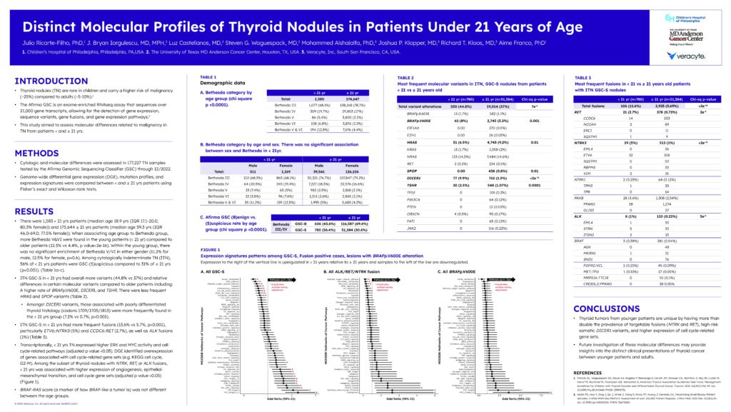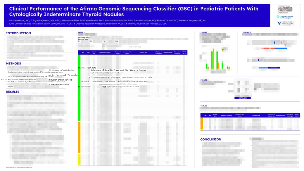 The Veracyte team recently attended the 2024 American Thyroid Association (ATA) Annual Meeting in Chicago, where we were happy to connect with physicians, answer questions about Afirma, and attend several informative presentations on the latest research in thyroidology. We also had the privilege of contributing our own research to the meeting with the following three posters: