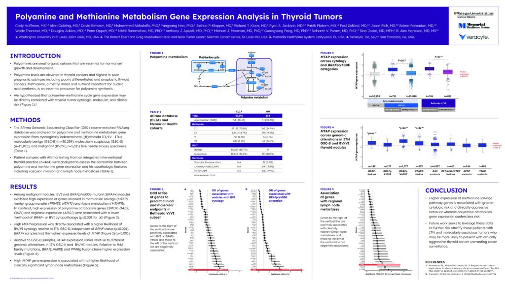 - 464 patient samples with Afirma testing from an integrated interventional thyroid practice. Histology data from this cohort was used to assess the correlation between polyamine and methionine gene expression and histopathologic features such as vascular invasion and lymph node metastases.