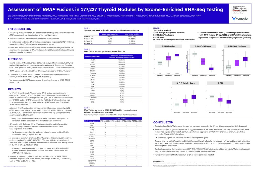 Out of the Xpression Atlas database of 177,227 thyroid nodule FNA samples, 382 samples were identified with BRAF fusions in this study (99% of which were reported as Afirma GSC Suspicious). These 382 samples were analyzed by Bethesda category, fusion partner genes, and 5 molecular signatures of aggressiveness.